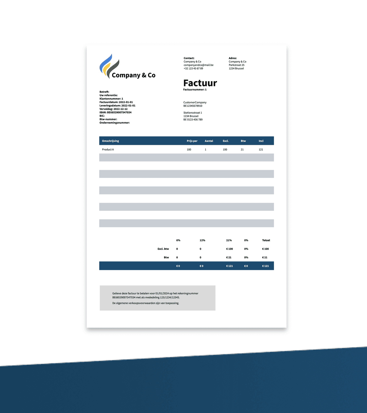 Een volledig gepersonaliseerde Billit factuur template voor €149. Jouw huisstijl wordt vertaald naar een sjabloon dat je klanten zullen herkennen en onthouden. Alles wordt naadloos geïntegreerd in jouw Billit omgeving, zodat je meteen aan de slag kunt.